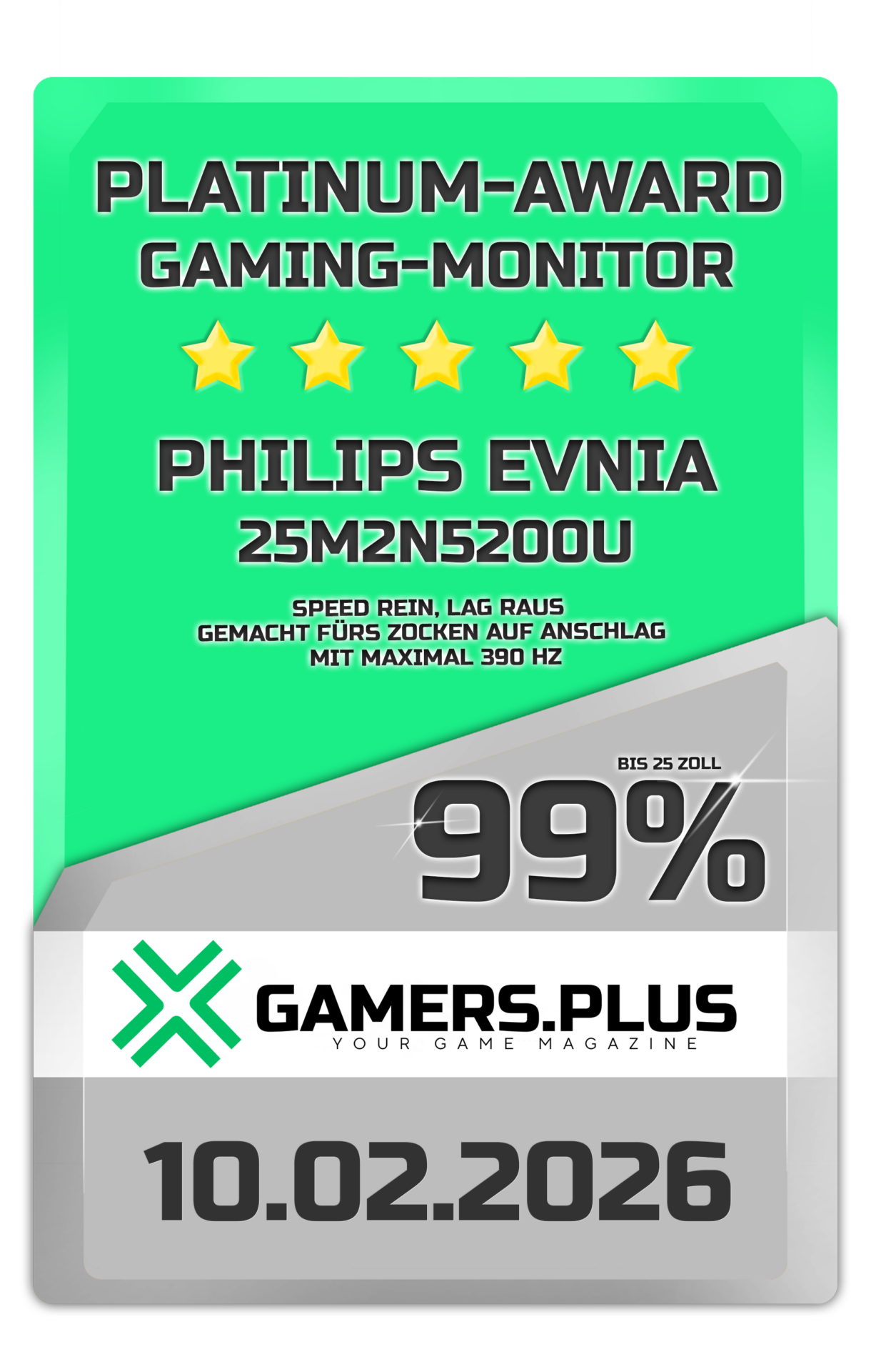 Mit dem 25M2N5200U setzt Philips Evnia ein kompromissloses Ausrufezeichen im E-Sport-Segment. Für seine übertaktbaren 390 Hz, die extrem niedrige Reaktionszeit von bis zu 0,3 ms und die konsequente Ausrichtung auf maximale Wettbewerbsperformance erhält der Monitor unseren Award für den leistungsstärksten High-End-E-Sport-Monitor des Jahres.