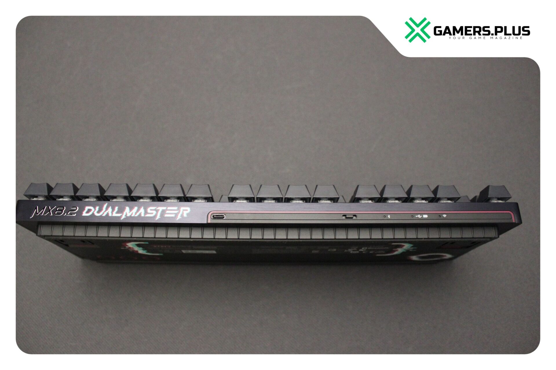 Die MX 8.2 Pro TMR Wireless setzt auf ein klassisches Tenkeyless-Layout, das vor allem bei kompetitiven Spielern beliebt ist. Der Verzicht auf den Nummernblock schafft mehr Platz für Mausbewegungen und sorgt für ein aufgeräumtes Setup. Das Gehäuse wirkt bewusst zurückhaltend, ohne verspielt zu sein. Eine Aluminium-Oberseite sorgt für Stabilität, während das Gesamtgewicht ausreichend hoch ausfällt, um auch bei hektischen Spielsituationen sicher auf dem Schreibtisch zu bleiben.